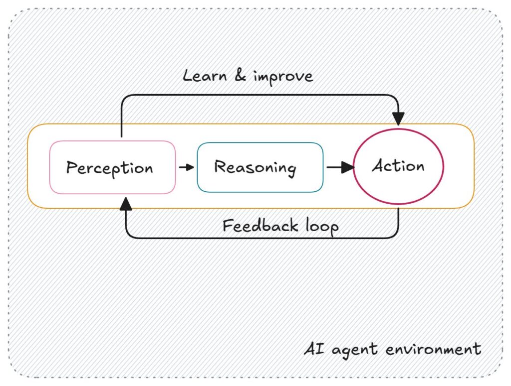 - Pensament (Reasoning) : L’agent processa la informació rebuda i decideix què fer basant-se en algoritmes, regles o models d’aprenentatge.